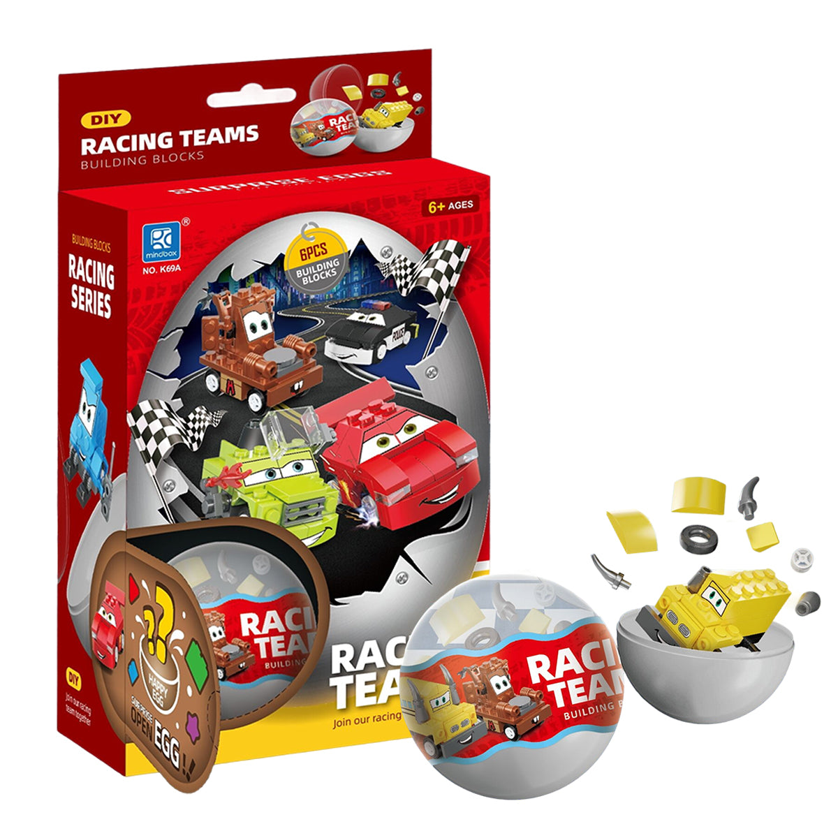 COMPLETE SET: 6-piece racing car building block collection featuring different vehicle designs packaged in 65mm surprise egg capsules