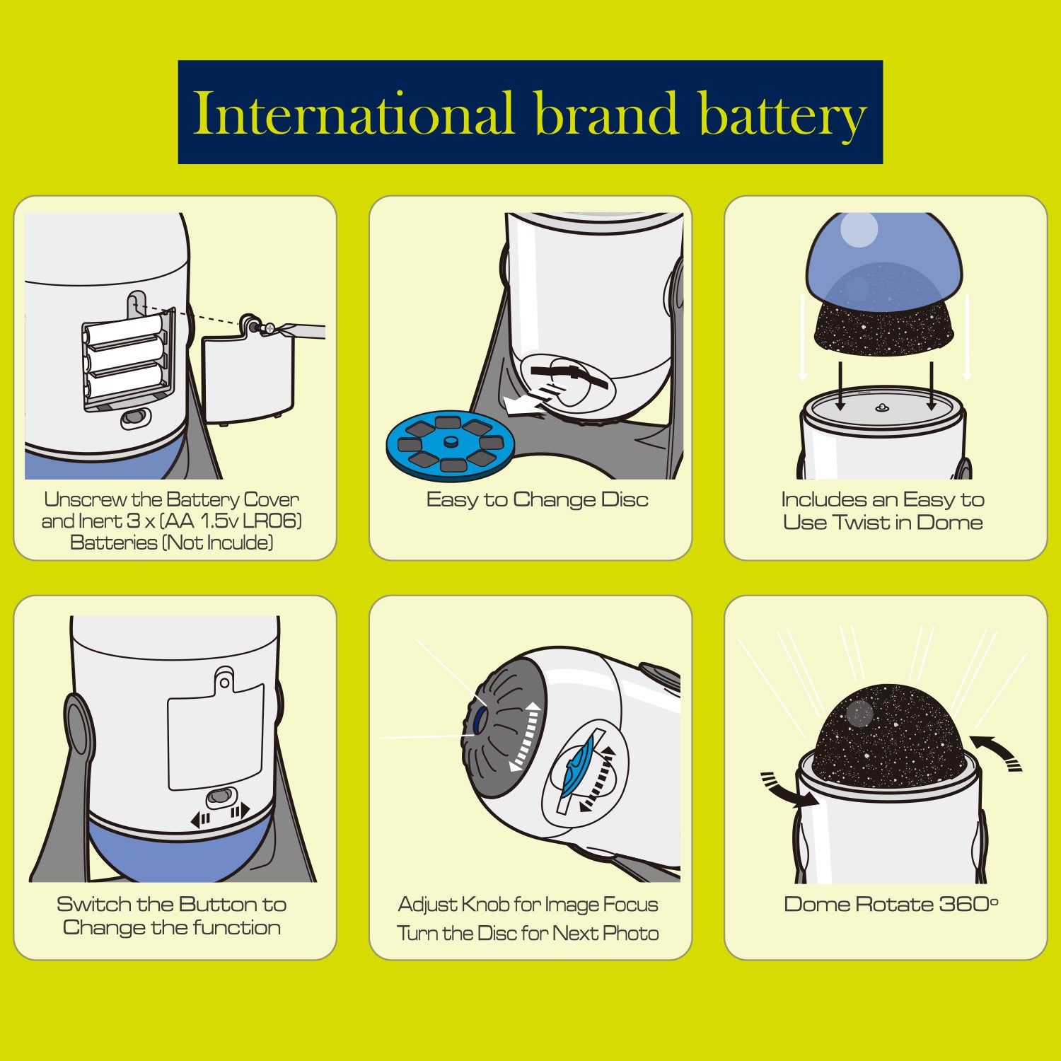 High quality slide projector will project a clear image up to one metre wide in a dark room. Project 24 color NASA images from 3 interchangeable slide discs with 8 images per disc. Rotating star or constellation patterns projected onto walls and ceiling. Transform your room into an outer space light show or add the night light dome to convert into a cool night light.