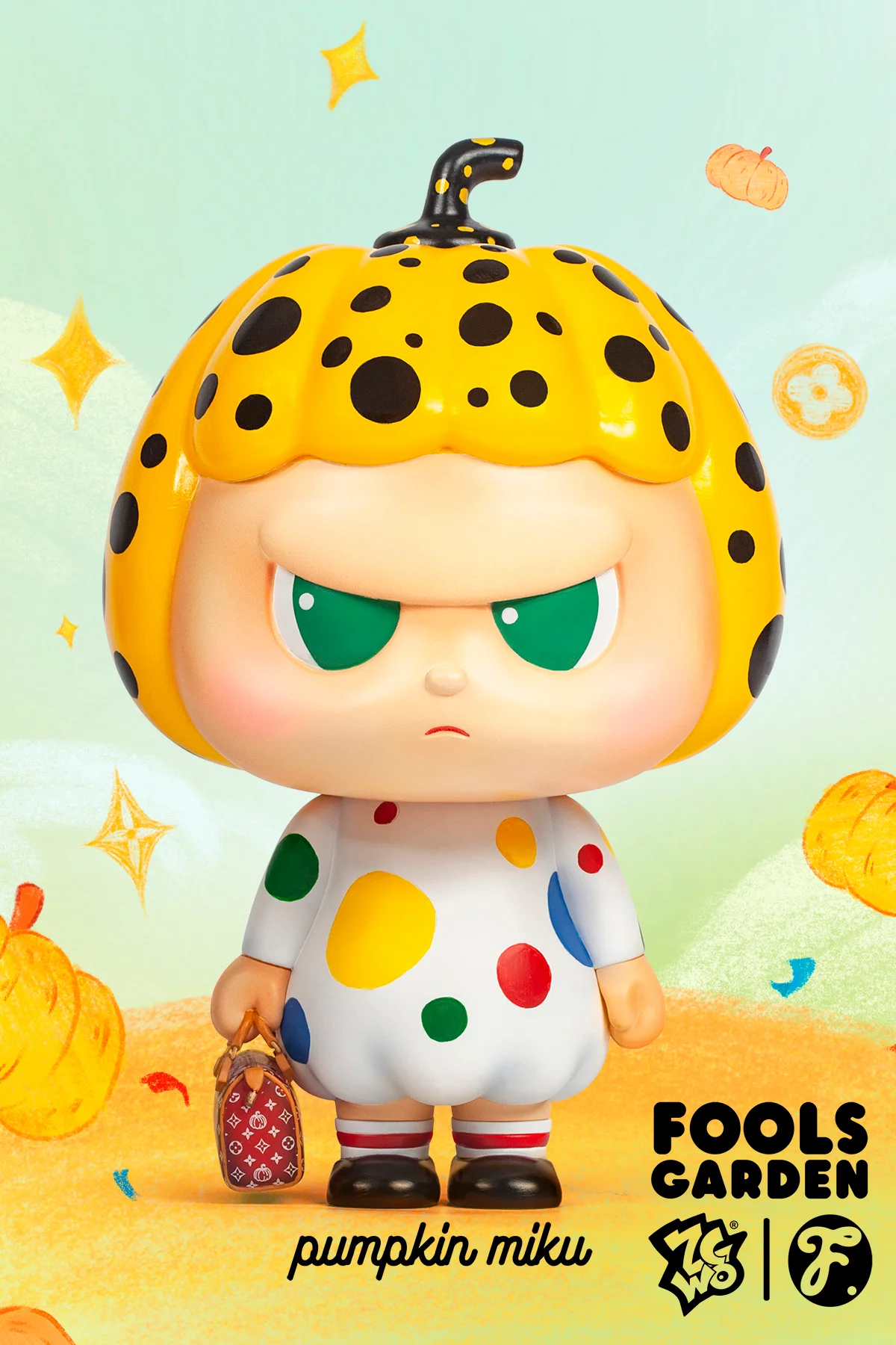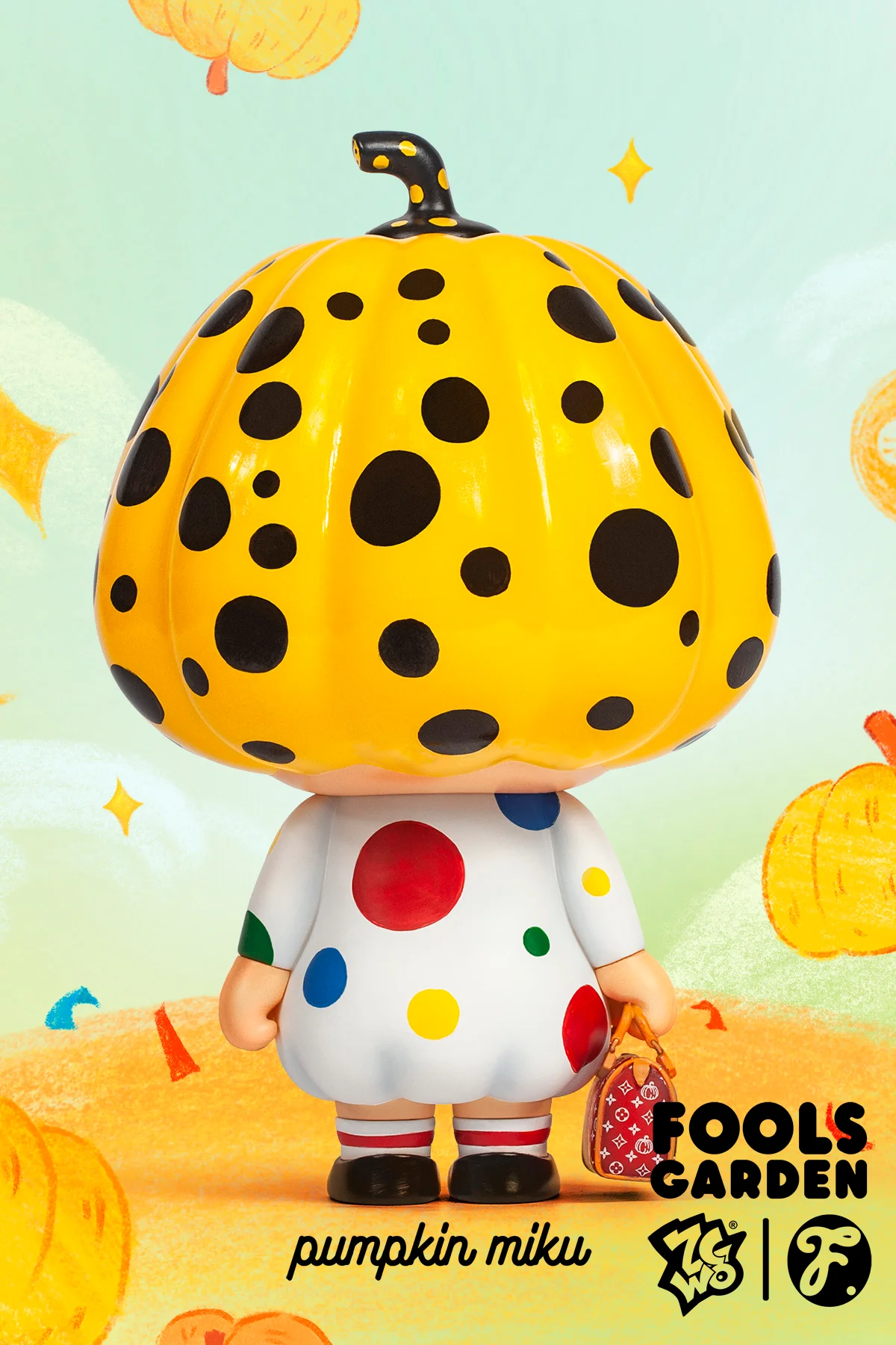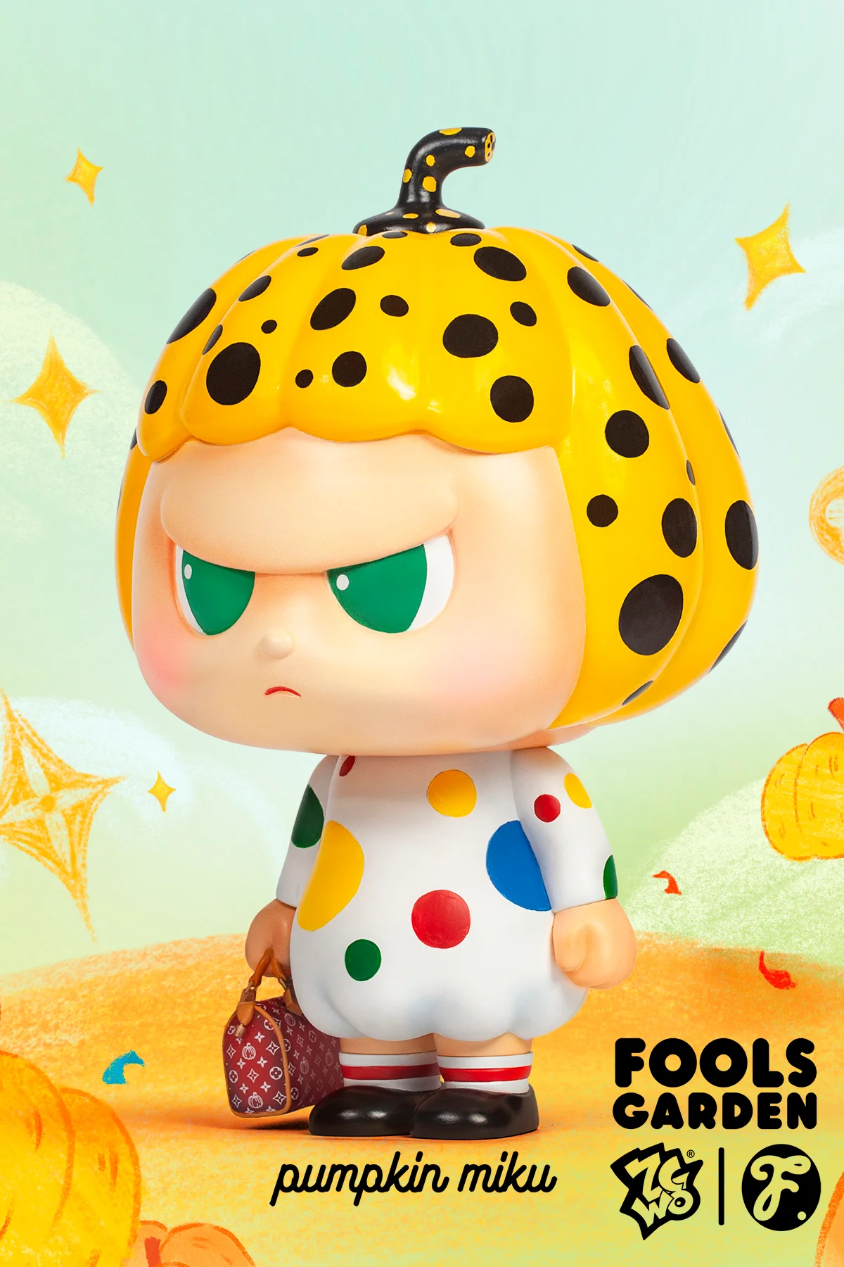 A classic, reimagined, eagerly awaited! FOOLS GARDEN // Pumpkin Miku, now available in her classic colors for the first time, features a playful pumpkin hairstyle with shaved bangs, a pure white polka-dot skirt, and a custom-made burgundy handbag. Luxurious details meticulously crafted create a perfect blend of innocence and chic, adding a touch of elegance to your wardrobe.