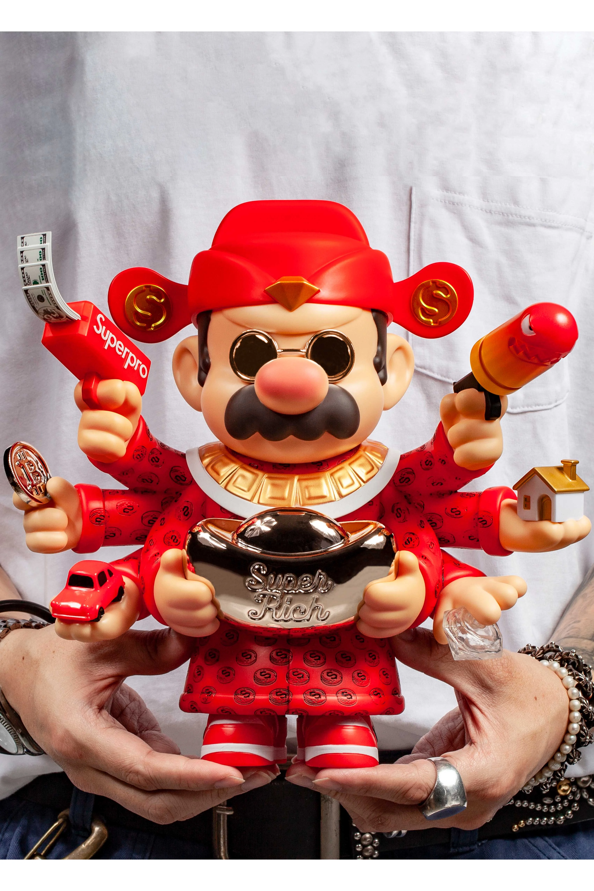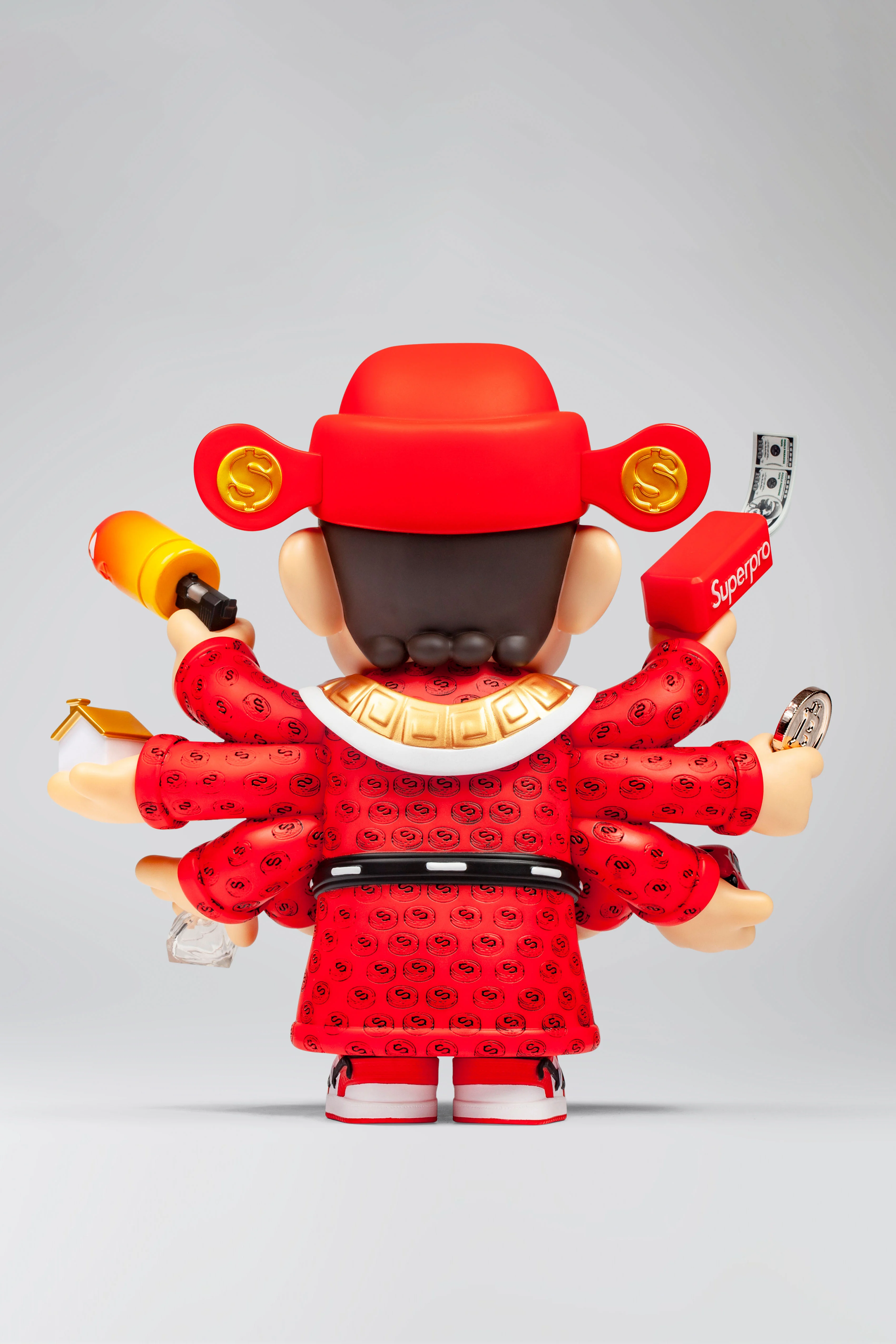 Wow, where did all that money come from? So much fortune is pouring in! It's the SUP.PRO ESNTL // ENDLESS GOW from the ZCWO x Fools Paradise collaboration! A pair of hands hold a giant, shimmering gold ingot. As if four weren't enough, he possesses eight, each holding a different fortune-attracting charm. This symbolizes abundance and prosperity, drawing wealth and prosperity to you! Wearing this striking red outfit home might just bring good luck and fortune to you and your family!